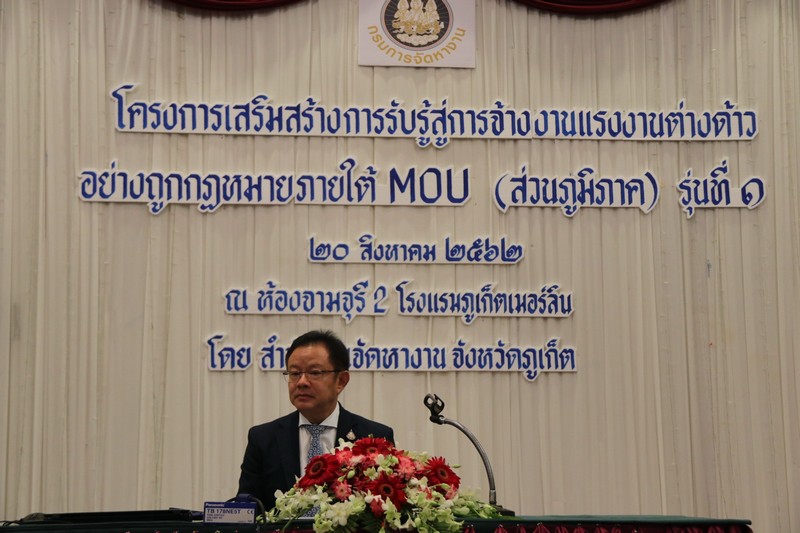 นายขัตติยะ แพนเดช จัดหางานจังหวัดภูเก็ต กล่าวว่า สืบเนื่องจากมติ ครม. เมื่อวันที่ 16 มกราคม 2562 ที่เห็นชอบการบริหารจัดการการทำงานของคนต่างด้าวในประเทศไทย โดยให้จัดตั้งศูนย์บริการเบล็ดเสร็จทุกจังหวัดทั่วประเทศ เพื่อจัดทำทะเบียนประวัติตรวจลงตราและขออนุญาตทำงานสำหรับแรงงานต่างด้าว สัญชาติกัมพูชา ลาว และเมียนมา ซึ่งจากการดำเนินการดังกล่าว แรงงานต่างด้าวจะได้รับอนุญาตให้อยู่ในราชอาณาจักรและทำงานถึงวันที่ 1 พฤศจิกายน 2562 สำหรับตำแหน่งกรรมกรและงานรับใช้ในบ้านและเมื่อสิ้นสุดการอนุญาตดังกล่าว แรงงานต่างด้าวจะต้องเดินทางกลับออกไปนอกราชอาณาจักรและหากนายจ้าง/สถานประกอบการยังมีความต้องการจะจ้างแรงงานต่างด้าวกลุ่มดังกล่าวต่อ จะต้องไปดำเนินการขอนำเข้าแรงงานต่างด้าวตามระบบ MOU เพื่อให้แรงงานต่างด้าวที่มีประสบการณ์ทำงานอยู่แล้วได้ทำงานแบบต่อเนื่อง ซึ่งจะต้องรีบดำเนินการก่อนที่การอนุญาตจะสิ้นสุดลง ดังนั้นเพื่อเสริมสร้างการรับรู้การจ้างงานแรงงานต่างด้าวอย่างถูกกฎหมายภายใต้ MOU ให้แก่นายจ้าง/สถานประกอบการและผู้ที่เกี่ยวได้รับทราบข้อมูล ขั้นตอบและแนวทางการดำเนินการรวมถึงการเตรียมความพร้อมก่อนใบอนุญาตทำงานของแรงงานต่างด้าวกลุ่มดังกล่าวจะหมดอายุ สำนักงานจัดหางานจังหวัดภูเก็ต จึงจัดโครงการเสริมสร้างการรับรู้สู่การจ้างงานแรงงานต่างด้าวภายใต้ MOU ขึ้น