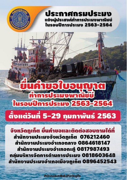 สำนักงานประมงจังหวัดภูเก็ต ขอให้ผู้ประสงค์ทำการประมงพาณิชย์ในน่านน้ำไทย ในรอบปีการประมง 2563 – 2564 ยื่นเรื่องก่อนขึ้นรอบการทำประมงใหม่ (2563 – 2564) กำหนดยื่นคำขอรับใบอนุญาตระหว่างวันที่ 5-29 กุมภาพันธ์ 2563 เท่านั้น