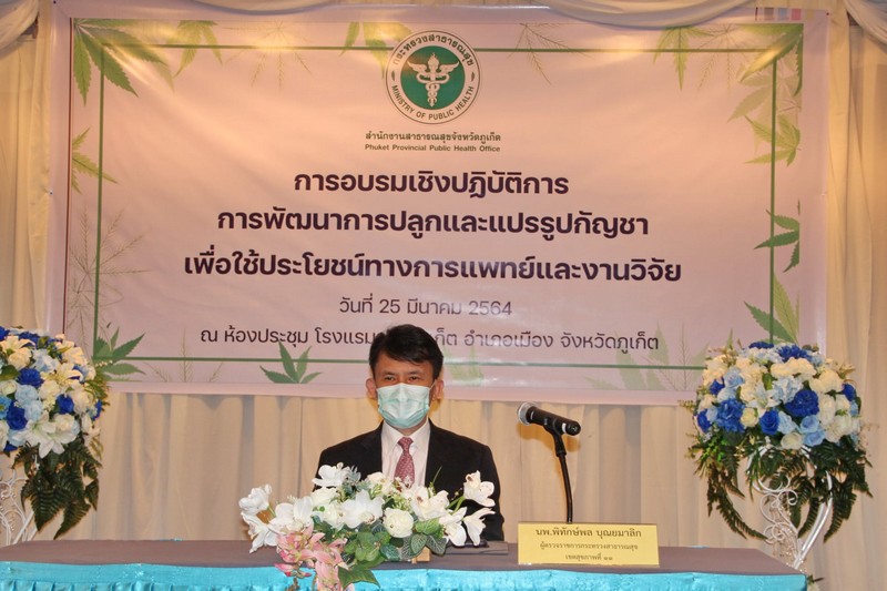 วันที่ 25 มีนาคม 2564 ที่ห้องโรงแรมดารา ภูเก็ต อำเภอเมือง จังหวัดภูเก็ต นายพิทักษ์พล บุณยมาลิก ผู้ตรวจราชการ กระทรวงสาธารณสุข เขตสุขภาพที่ 11 เป็นประธานเปิดการอบรมเชิงปฏิบัติการ การพัฒนาการปลูกและแปรรูปกัญชาเพื่อใช้ประโยชน์ทางการแพทย์และงานวิจัย โดยมี นายกู้ศักดิ์ กู้เกียรติภูล นายแพทย์สาธารณสุขจังหวัดภูเก็ต คณะผู้บริหาร สาธารณสุขอำเภอทั้ง 3 โรงพยาบาลส่งเสริมสุขภาพตำบลในพื้นที่จังหวัดภูเก็ต เจ้าหน้าที่สาธารณสุขจังหวัดภูเก็ต กลุ่มวิสาหกิจชุมชนที่เกี่ยวข้อง และประชาชนผู้สนใจ เข้าร่วม