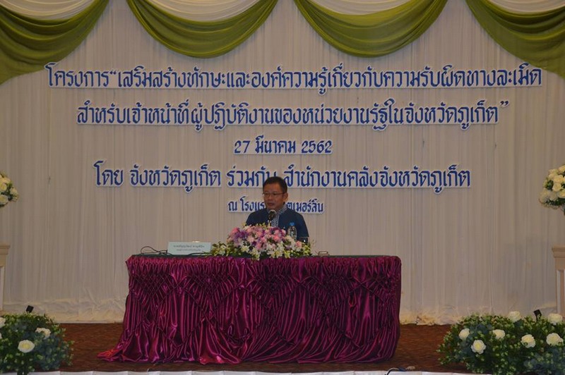 นาย ธัญญวัฒน์ ชาญพินิจ รองผู้ว่าราชการจังหวัดภูเก็ต กล่าวว่า การทุจริตคอร์รัปชั่นเป็นปัญหาใหญ่ของสังคมไทยมาเป็นเวลานาน และทวีความรุนแรงมากยิ่งขึ้นในปัจจุบัน ทำให้เกิดความเสียหายแก่เศรษฐกิจและสังคมในวงกว้าง ความไม่โปร่งใสและการจริตคอรัปชั่น เกิดขึ้นทั้งภาครัฐและเอกชน โดยพระราชบัญญัติความรับผิดทางละเมิดของเจ้าหน้าที่ พ.ศ. 2539 แยกความลับผิดทางละเมิดของเจ้าหน้าที่ที่เกิดจากการปฏิบัติหน้าที่และไม่ใช่ปฏิบัติหน้าที่ออกจากกัน ในการปฏิบัติหน้าที่ราชการโดยเฉพาะงานด้านการเงินการคลังและการพัสดุภาครัฐเป็นงานที่มีลักษณะที่อาจก่อให้เกิดความเสียหายได้โดยง่ายดังนั้นเจ้าหน้าที่และบุคคลที่เกี่ยวข้องจะต้องมีความรู้ความเข้าใจที่ถูกต้องชัดเจนเกี่ยวกับพระราชบัญญัติความรับผิด ทางละเมิด พ.ศ. 2539 และแนวทางปฏิบัติเพื่อป้องกันและแก้ไขปัญหาด้านการเงินการคลังและการพัสดุตลอดจนขั้นตอนวิธีการตรวจสอบข้อเท็จจริงการทำสำนวนคดีละเมิดซึ่งจะเป็นการอำนวยความยุติธรรมให้แก่เจ้าหน้าที่ของรัฐรักษาผลประโยชน์ให้แก่ราชการ