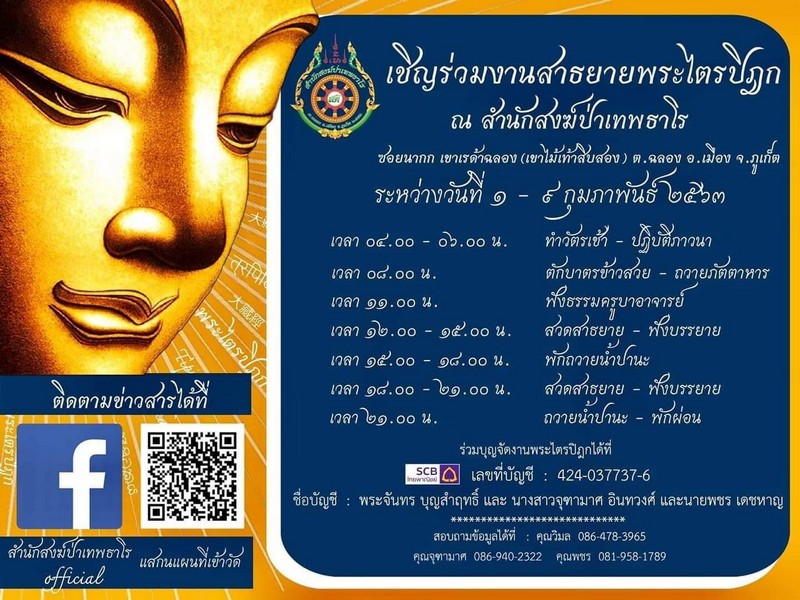 สำนักสงฆ์ป่าเทพธาโร ขอเชิญพุทธศาสนิกชนร่วมงานสาธยายพระไตรปิฏก ร่วมตักบาตรข้าวสวยพร้อมถวายภัตตาหาร ฟังสวดสาธยายพระไตรปิฎก เล่มที่ 11 ระหว่างวันที่ 1-9 ก.พ.63 ณ สำนักสงฆ์ป่าเทพธาโร ซอยนากก เขาไม้เท้าสิบสอง (เขาเรด้าฉลอง) ต.ฉลอง อ.เมืองภูเก็