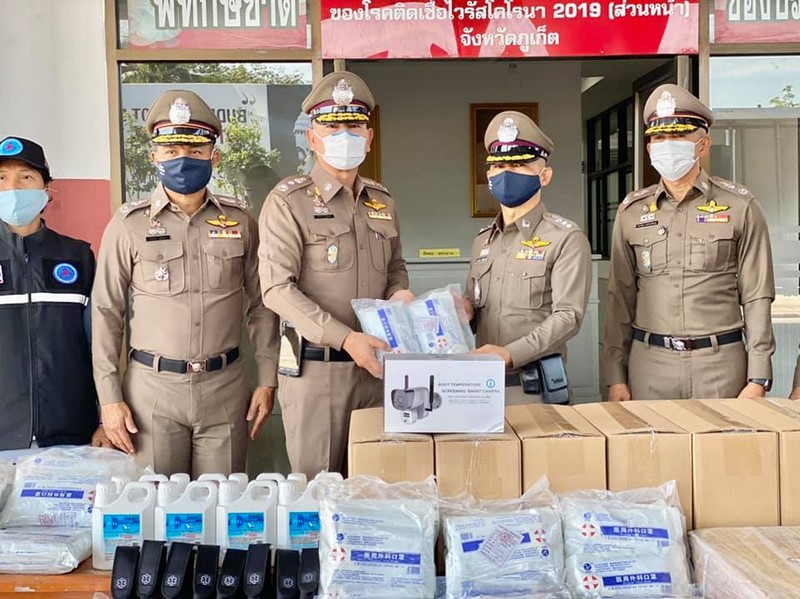 พล.ต.ท.กิตติ์รัฐ พันธุ์เพ็ชร์ ผบช.ภ.8 มอบอุปกรณ์การป้องกันโรค COVID-19 ให้เจ้าหน้าที่ฯประจำด่านตรวจภูเก็ต ประกอบด้วย กล้องตรวจวัดอุณหภูมิ ชนิดเชื่อมต่อสัญญาณ Wifi จำนวน 1 ชุด เพื่อใช้ในการวัดอุณหภูมิร่างกายป้องกันการแพร่ระบาดของเชื้อไวรัส COVID-19 หน้ากากอนามัย จำนวน 10,000 ชิ้น เจลแอลกอฮอล์ ฆ่าเชื้อ จำนวน 100 แกลลอน อุปกรณ์ไฟฉาย สำหรับการตรวจช่วงเวลากลางคืน จำนวน 50 กระบอก มอบปัจจัยเพื่อเป็นขวัญกำลังใจให้กับเจ้าหน้าที่ตำรวจผู้ปฏิบัติหน้าที่ และแม่ครัวจิตอาสาประจำโรงครัวสนามจังหวัดภูเก็ต และสาธิตการตรวจวัดอุณหภูมิด้วยเครื่องเทอร์โมสแกนประจำด่านตรวจท่าฉัตรไชย โดยมี พ.ต.อ.กัณต์ชวิศ โพธิ์ประสิทธิ์ ผกก.สภ.ท่าฉัตรไชย แม่บ้านโรงครัวสนาม และ อสม. เป็นตัวแทนรับมอบเพื่อนำอุปกรณ์ต่างๆไปใช้ให้เกิดประโยชน์กับส่วนรวมต่อไป