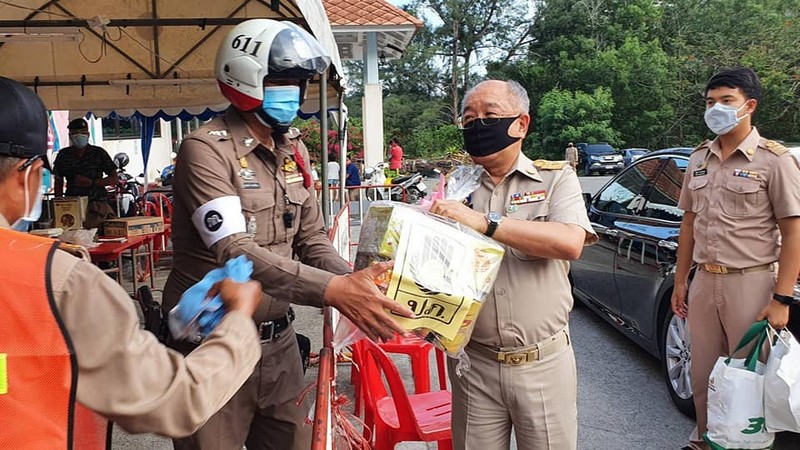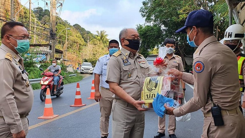 ผู้ว่าราชการจังหวัดภูเก็ตตรวจเยี่ยมให้กำลังใจและมอบถุงเครื่องอุปโภคบริโภค ให้เจ้าหน้าที่ที่ปฏิบัติงานตามจุดคัดกรองในพื้นที่รอยต่อตำบล/อำเภอของจังหวัดภูเก็ต ตามมาตรการควบคุมให้มีการเคลื่อนย้ายบุคคลและยานพาหนะให้น้อยที่สุด เพื่อควบคุมการแพร่ระบาดของโรคติดเชื้อไวรัสโควิด 19