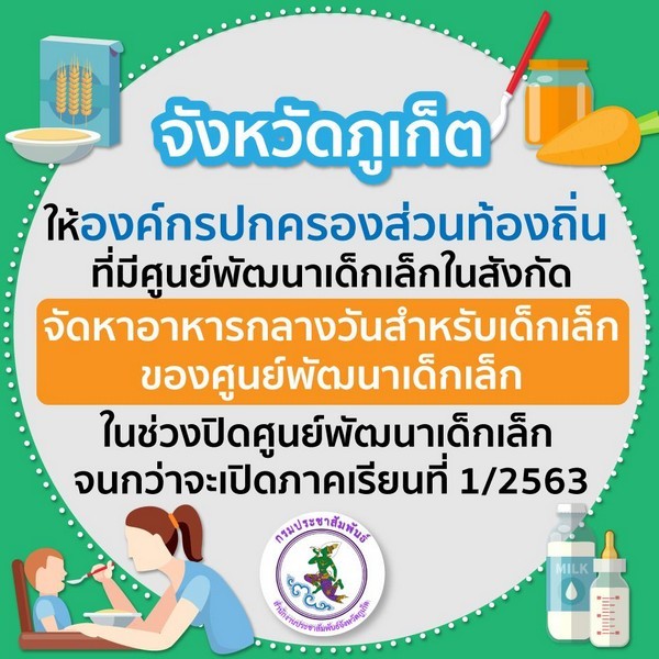 นายภัคพงศ์ ทวิพัฒน์ ผู้ว่าราชการจังหวัดภูเก็ต เปิดเผยว่า ทางจังหวัด ได้มีหนังสือสั่งการให้นายอำเภอทุกอำเภอ นายกเทศมนตรีนครภูเก็ต นายกเทศมนตรีเมืองป่าตอง และนายกเทศมนตรีเมืองกะทู้ ดำเนินการจัดหาอาหารกลางวันสำหรับเด็กเล็กของศูนย์พัฒนาเด็กเล็กในสังกัดในช่วงปิดศูนย์พัฒนาเด็กเล็กกรณีมีเหตุพิเศษ ตามวงเงินงบประมาณที่ได้รับการจัดสรรงบประมาณจากกรมส่งเสริมการปกครองส่วนท้องถิ่น ซึ่งอาศัยอำนาจตามระเบียบกระทรวงมหาดไทยว่าด้วยรายได้และรายจ่ายเงินของสถานศึกษาในสังกัดองค์กรปกครองส่วนท้องถิ่น พ. ศ. 2562 ข้อ 5 ประกอบข้อ 6( 1) (ก) และ ข้อ 9 ( 1) ที่กำหนดแนวทางการปฏิบัติในการจัดหาอาหารกลางวันสำหรับเด็กเล็กในศูนย์พัฒนาเด็กเล็กสังกัดองค์กรปกครองส่วนท้องถิ่นในช่วงสถานการณ์การแพร่ระบาดของไวรัสโควิด -19 และให้รายงานผลการดำเนินงานครั้งแรกวันอังคารที่ 5 พฤษภาคม 2563 และรายงานครั้งต่อไปทุกวันที่ 15 และวันที่ 30 ของเดือนจนกว่าจะมีการเปิดภาคเรียนที่ 1 ปีการศึกษา 2563