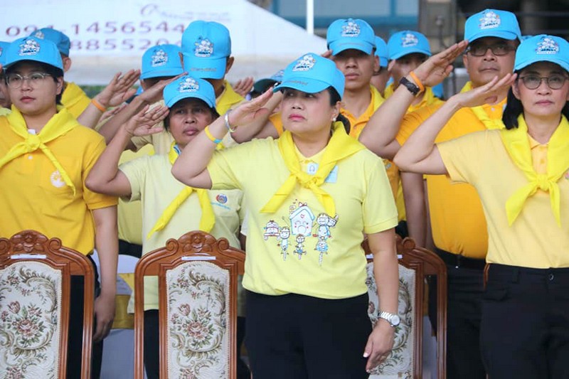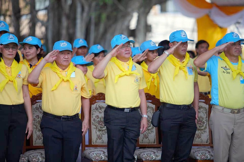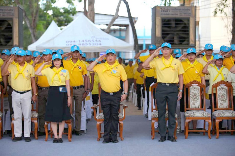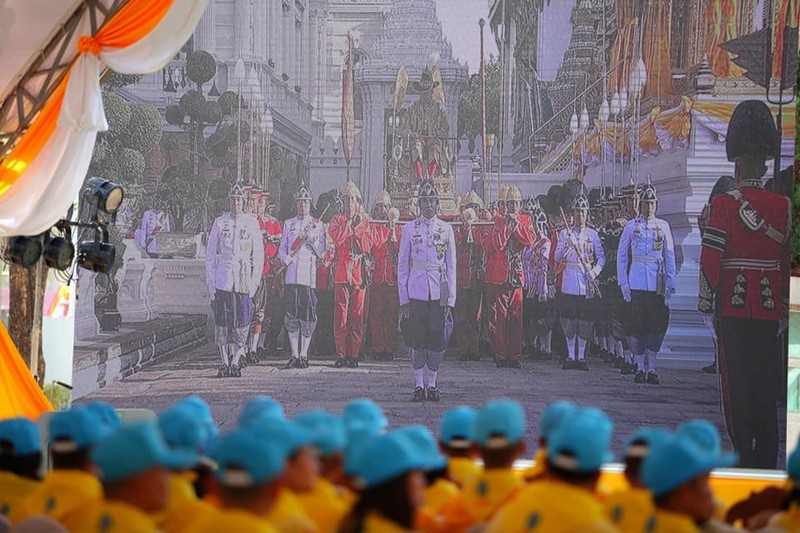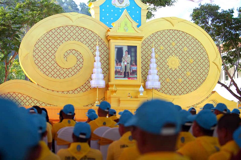 พสกนิกรชาวจังหวัดภูเก็ต สวมใส่เสื้อสีเหลืองร่วมรับชม พระราชพิธีบรมราชาภิเษก เสด็จพระราชดำเนินเลียบพระนครโดยขบวนพยุหยาตราทางสถลมารค จากโทรทัศน์รวมการเฉพาะกิจแห่งประเทศไทย ณ ศาลากลางจังหวัดภูเก็ต