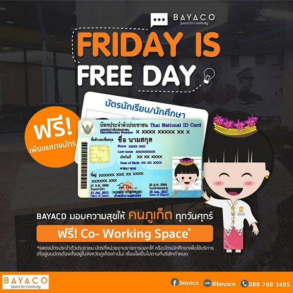 “สำหรับคนภูเก็ต ตอนนี้เรามีแคมเปญ Friday is freeday เพื่อให้คนภูเก็ต ได้เข้ามาทดลองใช้บริการ Bayaco Co-working space ฟรีทุกวันศุกร์ เพียงแสดงบัตรประชาชนภูเก็ต บัตรนักเรียน นักศึกษา ก็สามารถใช้บริการได้ฟรีจนถึงสิ้นปี 2562 โดยสามารถดูข้อมูลเพิ่มเติมได้ที่ Facebook : bayaco” นายวิศรุต กล่าวทิ้งท้าย