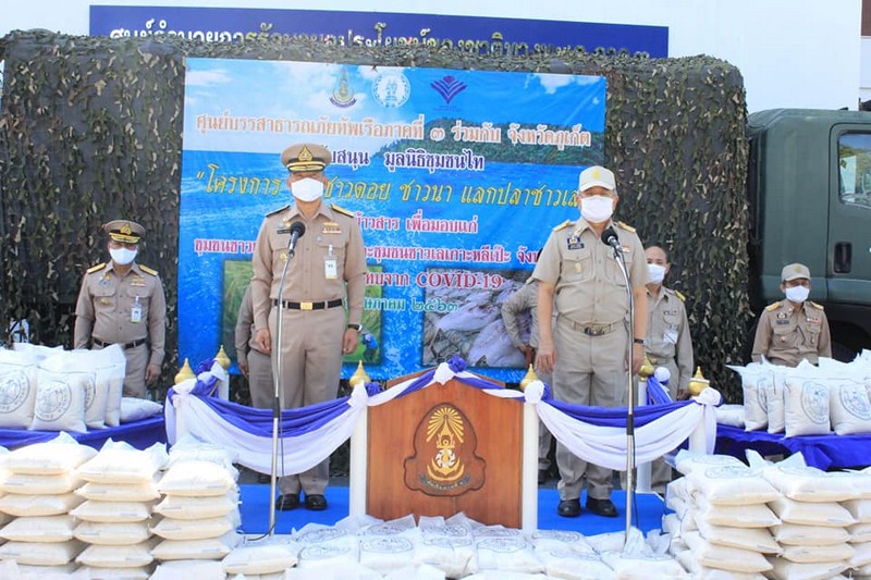 จังหวัดภูเก็ตได้ร่วมกับทัพเรือภาคที่ 3 ร่วมส่งมอบข้าวสารแก่ตัวแทนชาวเลตามโครงการ “ข้าวชาวดอย ชาวนา แลกปลาชาวเล”