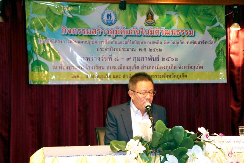 เมื่อวันที่ 8 กุมภาพันธ์ 2562 ที่ห้องประชุมโรงเรียน อบจ.เมืองภูเก็ต อำเภอเมืองภูเก็ต จังหวัดภูเก็ต นายธัญญวัฒน์ ชาญพินิจ รองผู้ว่าราชการจังหวัดภูเก็ต เป็นประธานเปิด กิจกรรมสร้างภูมิคุ้มกันในมิติวัฒนธรรมภายใต้โครงการตามแผนปฏิบัติการป้องกันและแก้ไขปัญหายาเสพติด จังหวัดภูเก็ต โดยมีนางพวงผกา เชาวน์ไวย ผู้อำนวยการกลุ่มยุทธศาสตร์และเฝ้าระวังทางวัฒนธรรมสำนักงานวัฒนธรรมจังหวัดภูเก็ต คณะครูอาจารย์ ผู้ปกครองและนักเรียนเข้าร่วม