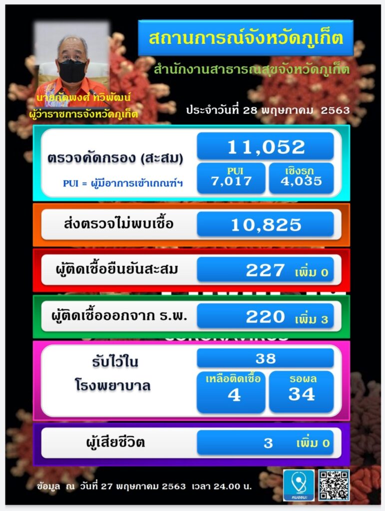 เมื่อวันที่ 28 พฤษภาคม 2563 คณะกรรมการโรคติดต่อจังหวัดภูเก็ต ขอแจ้งให้ทราบว่า ตั้งแต่วันที่ 5 มกราคม – 27 พฤษภาคม 2563 จังหวัดภูเก็ตมีผู้ติดเชื้อยืนยันโรคโควิด-19 แล้วจำนวน 227 ราย (ไม่พบรายใหม่)โดยผู้ติดเชื้อได้รับอนุญาต ให้กลับบ้าน 219 ราย (กลับบ้านเพิ่ม 3 ราย) เสียชีวิต 3 ราย (ไม่มีผู้เสียชีวิตเพิ่ม) จำหน่าย 1ราย (ไม่มีจำหน่ายเพิ่ม) กำลังรักษาพยาบาลอยู่ 4 ราย ทุกรายอาการอยู่ในเกณฑ์ที่ดี