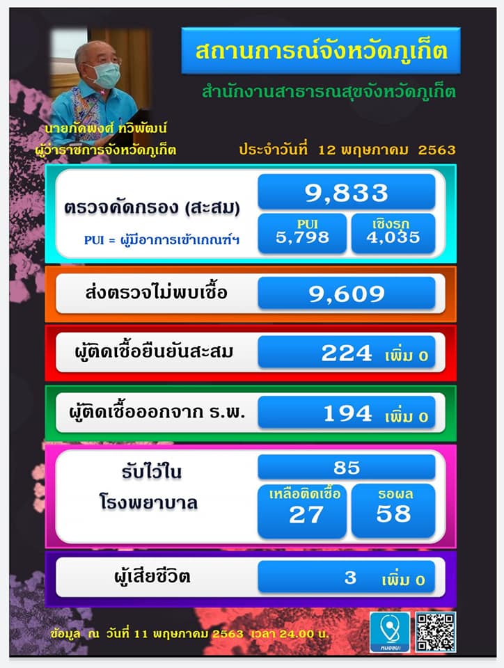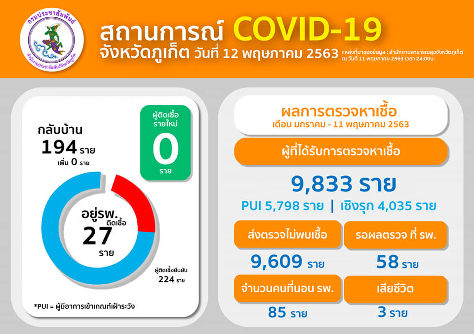 เมื่อวันที่ 12 พฤษภาคม 2563 คณะกรรมการโรคติดต่อจังหวัดภูเก็ต ขอแจ้งให้ทราบว่าตั่งแต่วันที่ 5 มกราคม – 11 พฤษภาคม 2563 จังหวัดภูเก็ตมีผู้ติดเชื้อยืนยันโรคโควิด – 19 แล้วจำนวน 224 ราย (ไม่พบรายใหม่) โดยผู้ติดเชื้อได้รับอนุญาตให้กลับบ้าน 193 ราย (ไม่มีกลับบ้านเพิ่ม) เสียชีวิต 3 ราย (ไม่มีผู้เสียชีวิตเพิ่ม) จำหน่าย 1 ราย (จำหน่ายเนื่องด้วยเสียชีวิตจากอุบัติเหตุรถจักรยานยนต์) กำลังรักษาพยาบาลอยู่ 27 ราย ทุกรายอาการอยู่ในเกณฑ์ที่ดี