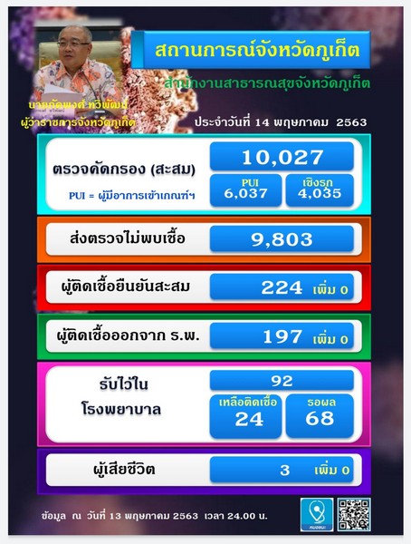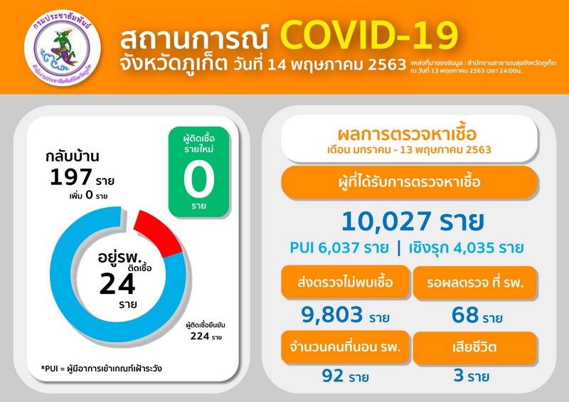 เมื่อวันที่ 14 พฤษภาคม 2563 คณะกรรมการโรคติดต่อจังหวัดภูเก็ต ขอแจ้งให้ทราบว่าตั้งแต่วันที่ 5 มกราคม – 13 พฤษภาคม 2563 จังหวัดภูเก็ตมีผู้ติดเชื้อยืนยันโรคโคโรนา – 19 แล้วจำนวน 224 ราย (ไม่พบรายใหม่) โดยผู้ติดเชื้อได้รับอนุญาตให้กลับบ้าน 196 ราย (ไม่มีกลับบ้านเพิ่ม) เสียชีวิต 3 ราย (ไม่มีผู้เสียชีวิตเพิ่ม) จำหน่าย 1 ราย (จำหน่ายเนื่องด้วยเสียชีวิตจากอุบัติเหตุรถจักรยานยนต์) กำลังรักษาพยาบาลอยู่ 24 ราย ทุกรายอาการอยู่ในเกณฑ์ที่ดี