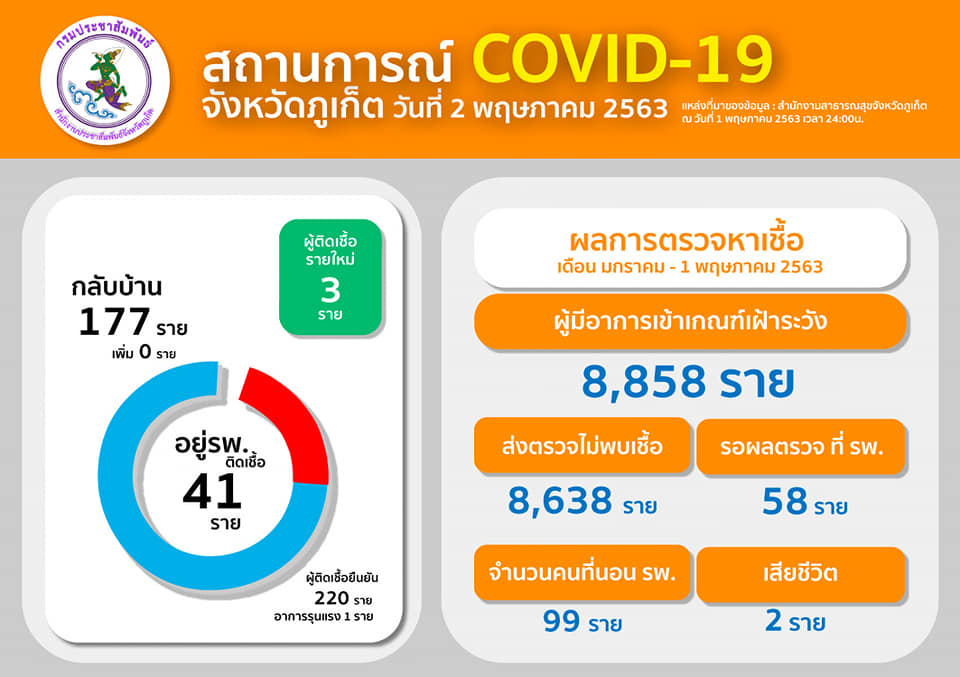 เมื่อวันที่ 2 พฤษภาคม 2563 คฯกรรมการโรคติดต่อจังหวัดภูเก็ต ขอแจ้งให้ทราบว่า ตั่งแต่วันที่ 5 มกราคม – 1 พฤษภาคม 2563 จังหวัดภูเก็ตมีผู้ติดเชื้อยืนยันโรคโควิด – 19 แล้วจำนวน 220 ราย (รายใหม่ 3 ราย) โดยผู้ติดเชื้อได้รับอนุญาตให้กลับบ้าน 176 ราย (ไม่มีกลับบ้านเพิ่ม) เสียชีวิต 2 ราย จำหน่าย 1 ราย (จำหน่ายเนื่องด้วยเสียชีวิตจากอุบัติเหตุรถจักรยานยนต์) กำลังรักษาพยาบาลอยู่ 41 ราย ในจำนวนนี้ อาการรุนแรง 1 ราย ที่เหลืออาการอยู่ในเกณฑ์ที่ดี