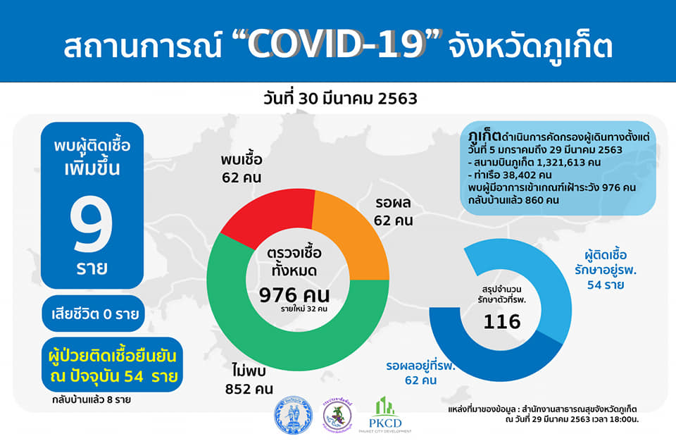 เมื่อวันที่ 30 มีนาคม 2563 คณะกรรมการโรคติดต่อจังหวัดภูเก็ตขอแจ้งให้ทราบว่าวันที่ 29 มีนาคม 2563 จังหวัดภูเก็ต มีผู้ป่วยยืนยันโรคโควิด-19 รายใหม่เพิ่ม 9 รายโดยตั้งแต่วันที่ 5 มกราคม ถึง 29 มีนาคม 2563