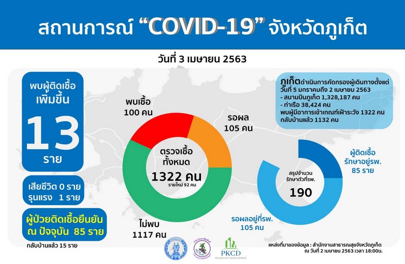 คณะกรรมการโรคติดต่อจังหวัดภูเก็ต ขอแจ้งให้ทราบว่า ตั้งแต่วันที่ 5 มกราคม – 2 เมษายน 2563 จังหวัดภูเก็ตผู้มีอาการเข้าเกณฑ์เฝ้าระวังสะสมทั้งหมด 1,322 ราย ตรวจไม่พบเชื้อ 1,117 ราย (กลับบ้านแล้ว)