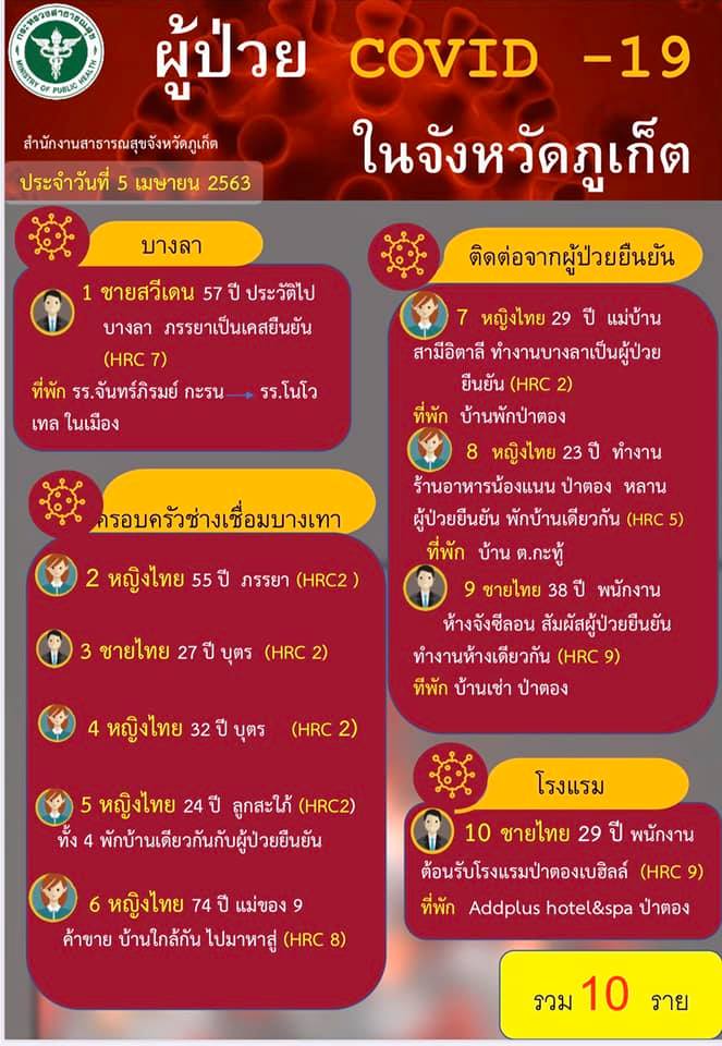 – ลำดับที่ 1 ผู้ป่วยรายที่ 110 ผู้ชายชาวสวีเดน อายุ 40 ปี เป็นนักท่องเที่ยว มาถึงประเทศไทยวันที่ 13 มีนาคม เดินทางมาเที่ยวกับภรรยา ซึ่งได้รับการตรวจยืนยันเป็นผู้ป่วยโรคโควิด – 19 รายที่ 77 เมื่อวันที่ 1 เมษายน มีประวัติไปบริเวณซ.บางลา ต.ป่าตอง อ.กะทู้ ยังไม่มีอาการป่วย ผู้สัมผัสความเสี่ยงสูงกับผู้ป่วยรายนี้ 7 ราย