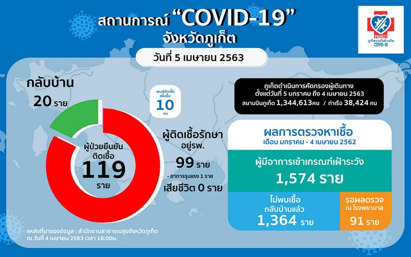 จังหวัดภูเก็ตมีผู้ป่วยยืนยันโรคโควิด-19 แล้วจำนวน 119 ราย (รายใหม่ 10 ราย) โดยผู้ป่วยรักษาหายกลับบ้าน 20 ราย กำลังรักษาพยาบาลอยู่ 99 ราย