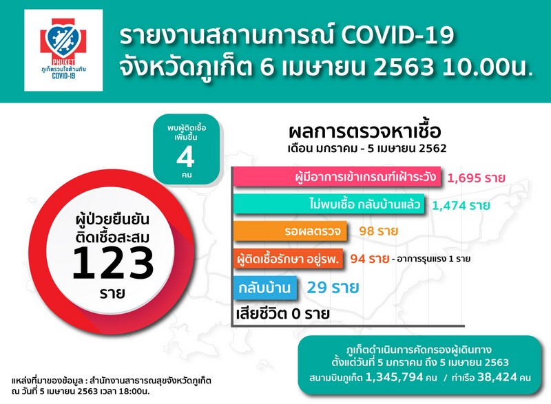 จังหวัดภูเก็ตมีผู้ป่วยยืนยันโรคโควิด-19 แล้วจำนวน 123 ราย (รายใหม่ 4 ราย) โดยผู้ป่วยรักษาหายกลับบ้าน 29 ราย กำลังรักษาพยาบาลอยู่ 94 ราย