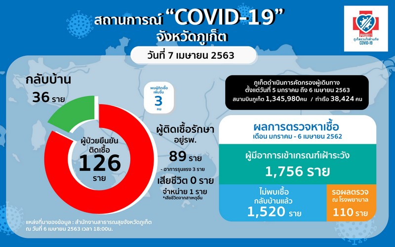 จังหวัดภูเก็ตมีผู้ป่วยยืนยันโรคโควิด-19 แล้วจำนวน 126 ราย รายใหม่ 3 ราย โดยผู้ป่วยรักษาหายกลับบ้าน 36 ราย กำลังรักษาพยาบาลอยู่ 89 ราย