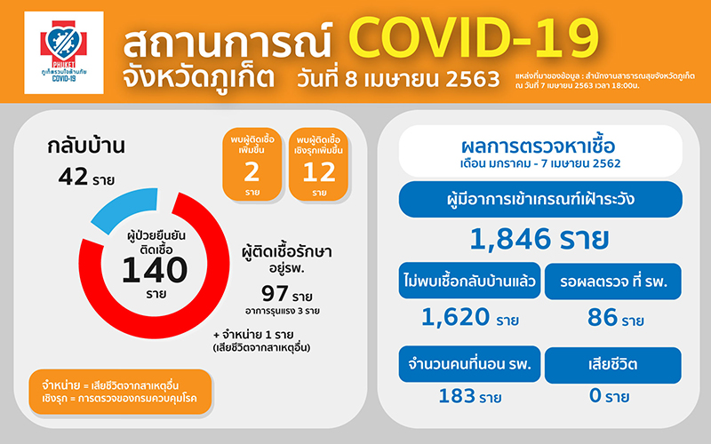 วันที่ 8 เมษายน 2563 คณะกรรมการโรคติดต่อจังหวัดภูเก็ต ขอแจ้งให้ทราบว่า ตั้งแต่วันที่ 5 มกราคม – 7 เมษายน 2563 จังหวัดภูเก็ตมีผู้ป่วยยืนยันโรคโควิด-19 แล้วจำนวน 140 ราย (รายใหม่ 14 ราย) โดยผู้ป่วยรักษาหายกลับบ้าน 42 ราย จำหน่าย 1 ราย ( จำหน่ายด้วยเสียชีวิตจากเหตุการณ์อื่น) กำลังรักษาพยาบาลอยู่ 97 ราย ในจำนวนนี้ อาการรุนแรง 3 ราย เสียชีวิต – ราย ที่เหลืออาการอยู่ในเกณฑ์ที่ดี ทั้งนี้ผู้ป่วยทั้ง 126 รายนี้รวมอยู่ในรายงานผู้ป่วยติดเชื้อยืนยันที่กระทรวงสาธารณสุขได้แถลงไปก่อนหน้านี้แล้ว