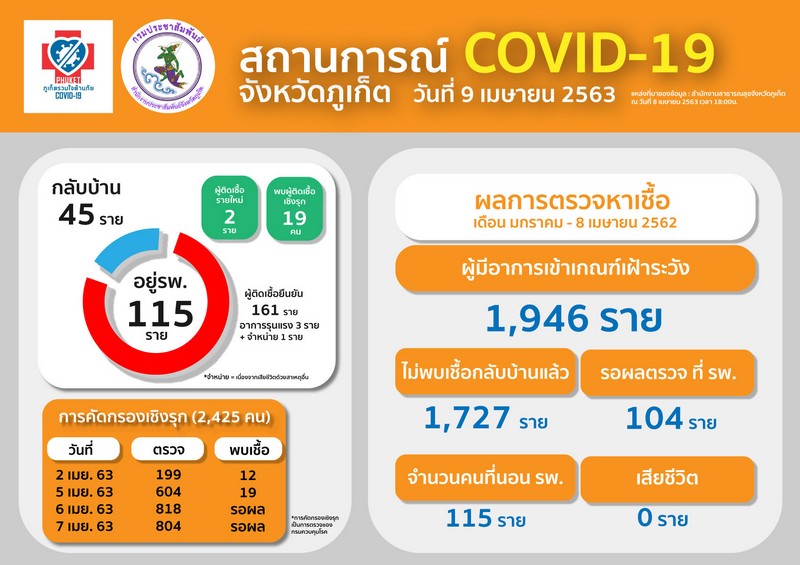 วันที่ 9 เมษายน 2563 คณะกรรมการโรคติดต่อจังหวัดภูเก็ต ขอแจ้งให้ทราบว่า ตั้งแต่วันที่ 5 มกราคม – 8 เมษายน 2563 จังหวัดภูเก็ตมีผู้ป่วยยืนยันโรคโควิด-19 แล้วจำนวน 161ราย (รายใหม่ 21 ราย) โดยผู้ป่วยรักษาหายกลับบ้าน 45 ราย จำหน่าย 1 ราย ( จำหน่ายด้วยเสียชีวิตจากเหตุการณ์อื่น) กำลังรักษาพยาบาลอยู่ 115 ราย ในจำนวนนี้ อาการรุนแรง 3 ราย เสียชีวิต – ราย ที่เหลืออาการอยู่ในเกณฑ์ที่ดี