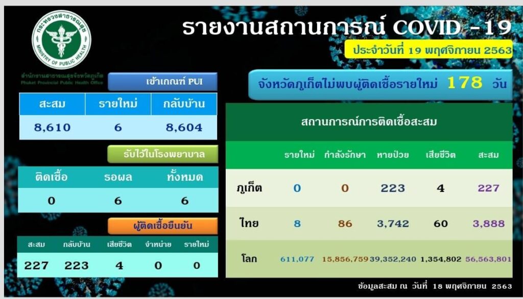 วันที่ 19 พฤศจิกายน พ.ศ. 2563 จังหวัดภูเก็ต ดำเนินการตามมาตรการควบคุมและป้องกันการแพร่กระจายเชื้อโรควัสโคโรน่า COVID-19 มีขั้นตอนการดูแลผู้ที่เดินทางกลับจากต่างประเทศอย่างเคร่งครัดและต่อเนื่อง โดยได้ดูแลจัดให้เข้าพักในสถานที่กักตัวที่จังหวัดจัดเตรียมไว้ทั้ง local Quarantine และ Alternative Local Quarantine เป็นเวลา 14 วัน ตามระบบขั้นตอนทุกราย มีการปฐมนิเทศผู้เข้าพักกักตัว ส่งตรวจหาเชื้อ Covid – 19 ทุกราย รายละ 2 ครั้ง เพื่อให้เกิดความมั่นใจในการหยุดการแพร่กระจายเชื้อต่อในชุมชน