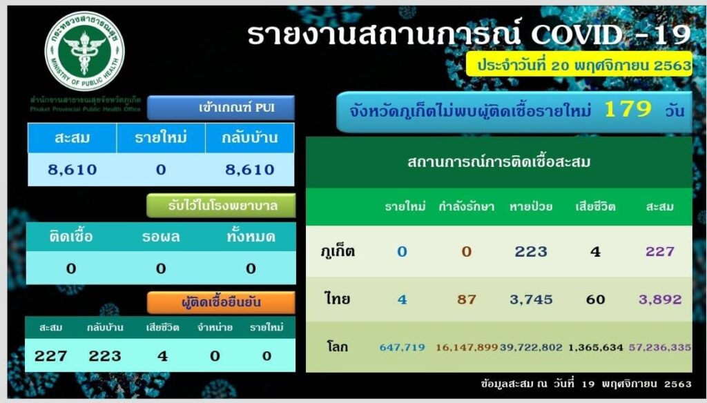 วันที่ 20 พฤศจิกายน พ.ศ. 2563จังหวัดภูเก็ต ดำเนินการตามมาตรการควบคุมและป้องกันการแพร่กระจายเชื้อโรควัสโคโรน่า COVID-19 มีขั้นตอนการดูแลผู้ที่เดินทางกลับจากต่างประเทศอย่างเคร่งครัดและต่อเนื่อง โดยได้ดูแลจัดให้เข้าพักในสถานที่กักตัวที่จังหวัดจัดเตรียมไว้ทั้ง local Quarantine และ Alternative Local Quarantine เป็นเวลา 14 วัน ตามระบบขั้นตอนทุกราย มีการปฐมนิเทศผู้เข้าพักกักตัว ส่งตรวจหาเชื้อ Covid – 19 ทุกราย รายละ 2 ครั้ง เพื่อให้เกิดความมั่นใจในการหยุดการแพร่กระจายเชื้อต่อในชุมชน