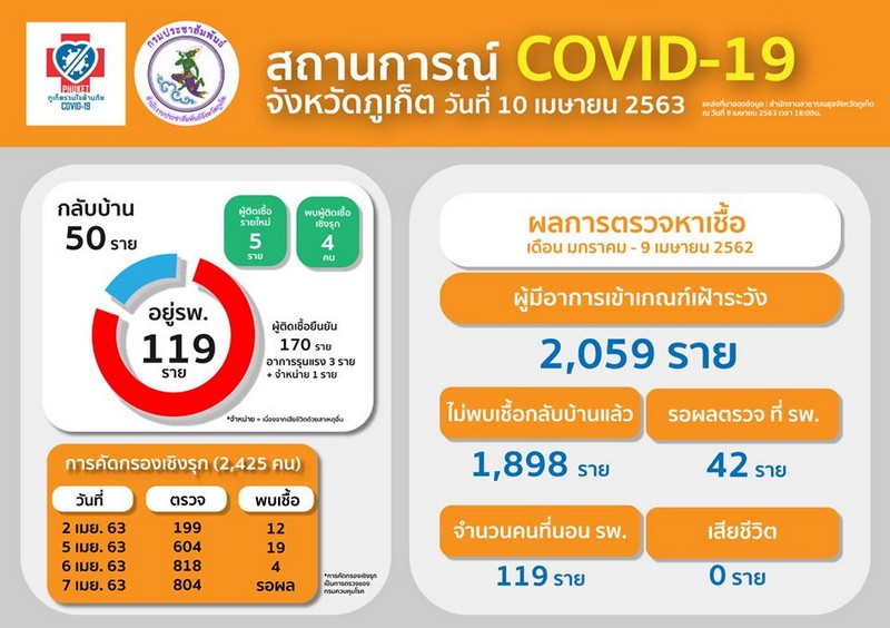 จังหวัดภูเก็ตมีผู้ป่วยยืนยันโรคโควิด- 19 แล้วจํานวน 170 ราย รายใหม่ 5 ราย และตรวจคัดกรองเชิงรุก 4 ราย โดยผู้ป่วยรักษาหายกลับบ้าน 50 ราย