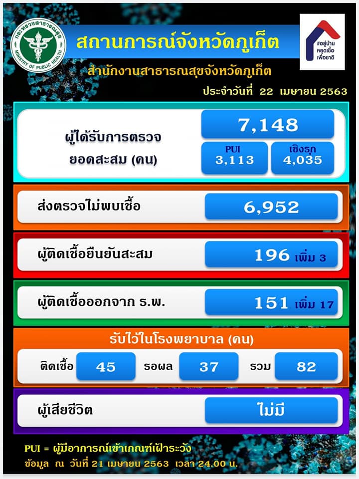 จังหวัดภูเก็ตมีผู้ติดเชื้อยืนยันโรคโควิด-19 แล้วจำนวน 196ราย รายใหม่ 3 ราย โดยผู้ติดเชื้อได้รับอนุญาตให้ กลับบ้าน 150 ราย