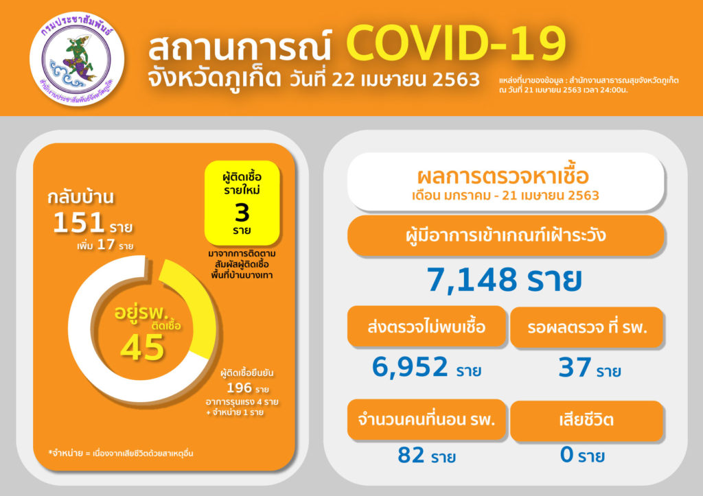 วันที่ 22 เมษายน 2563คณะกรรมการโรคติดต่อจังหวัดภูเก็ต ขอแจ้งให้ทราบว่า ตั้งแต่วันที่ 5 มกราคม – 21 เมษายน 2563 จังหวัดภูเก็ตมีผู้ติดเชื้อยืนยันโรคโควิด-19 แล้วจำนวน 196ราย (รายใหม่ 3 ราย) โดยผู้ติดเชื้อได้รับอนุญาตให้ กลับบ้าน 150 ราย (เพิ่มขึ้นจากเดิม 17 ราย) จำหน่าย 1 ราย (จำหน่าย เนื่องด้วยเสียชีวิตจากอุบัติเหตุรถจักรยานยนต์) กำลังรักษาพยาบาลอยู่ 45 ราย ในจำนวนนี้ อาการรุนแรง 4 ราย ไม่มีผู้เสียชีวิต ที่เหลืออาการอยู่ในเกณฑ์ที่ดี