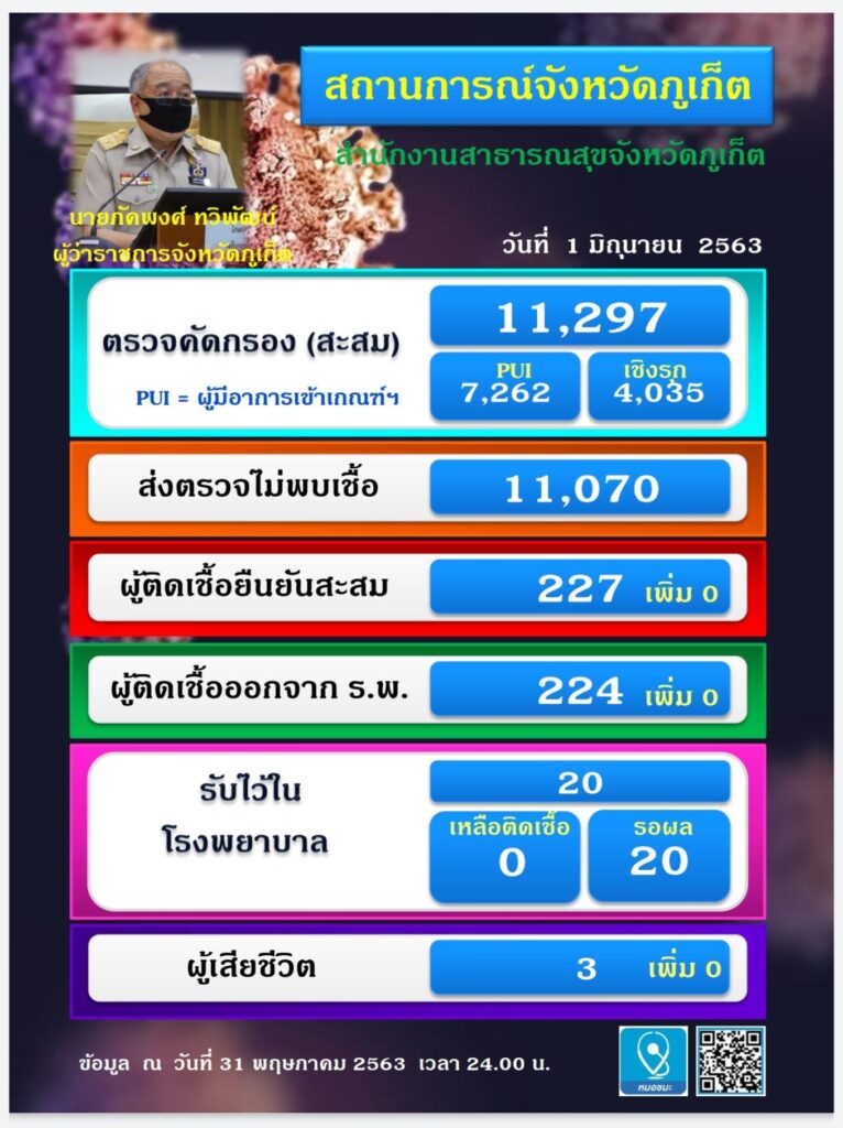 เมื่อวันที่ 1 มิถุนายน 2563 คณะกรรมการโรคติดต่อจังหวัดภูเก็ต ขอแจ้งให้ทราบว่า ตั้งแต่วันที่ 5 มกราคม – 31 พฤษภาคม 2563 จังหวัดภูเก็ตมีผู้ติดเชื้อยืนยันโรคโควิด-19 แล้วจำนวน 227 ราย (ไม่พบรายใหม่) โดยผู้ติดเชื้อได้รับอนุญาต ให้กลับบ้าน 223 ราย (ไม่มีผู้ติดเชื้อกลับบ้านเพิ่ม) เสียชีวิต 3 ราย (ไม่มีผู้เสียชีวิตเพิ่ม) จำหน่าย 1 ราย (ไม่มีจำหน่ายเพิ่ม) ปัจจุบันไม่มีผู้ติดเชื้อยืนยันโรคโควิด-19 รับการรักษาพยาบาล
