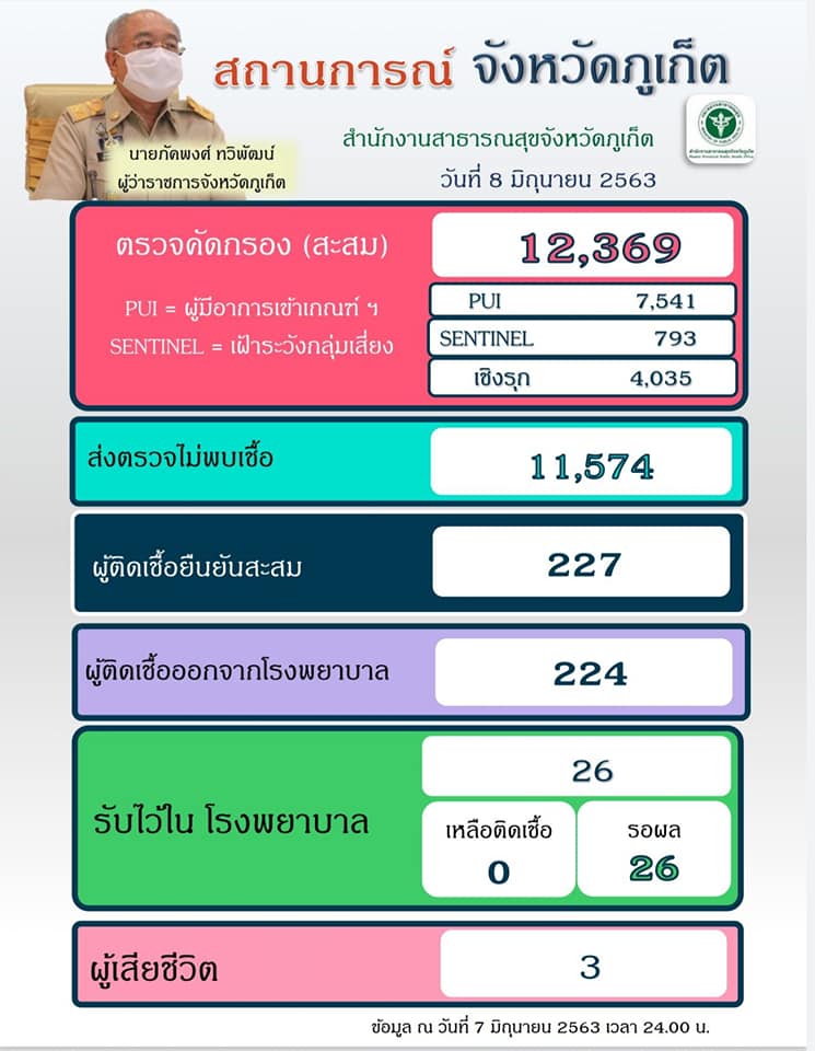 จังหวัดภูเก็ตมีผู้ติดเชื้อยืนยันโรคโควิด-19 จำนวน 227 ราย รักษาหายให้กลับบ้าน 223 ราย เสียชีวิต 3 ราย จำหน่าย 1 ราย ไม่มีผู้ติดเชื้อรายใหม่เพิ่ม