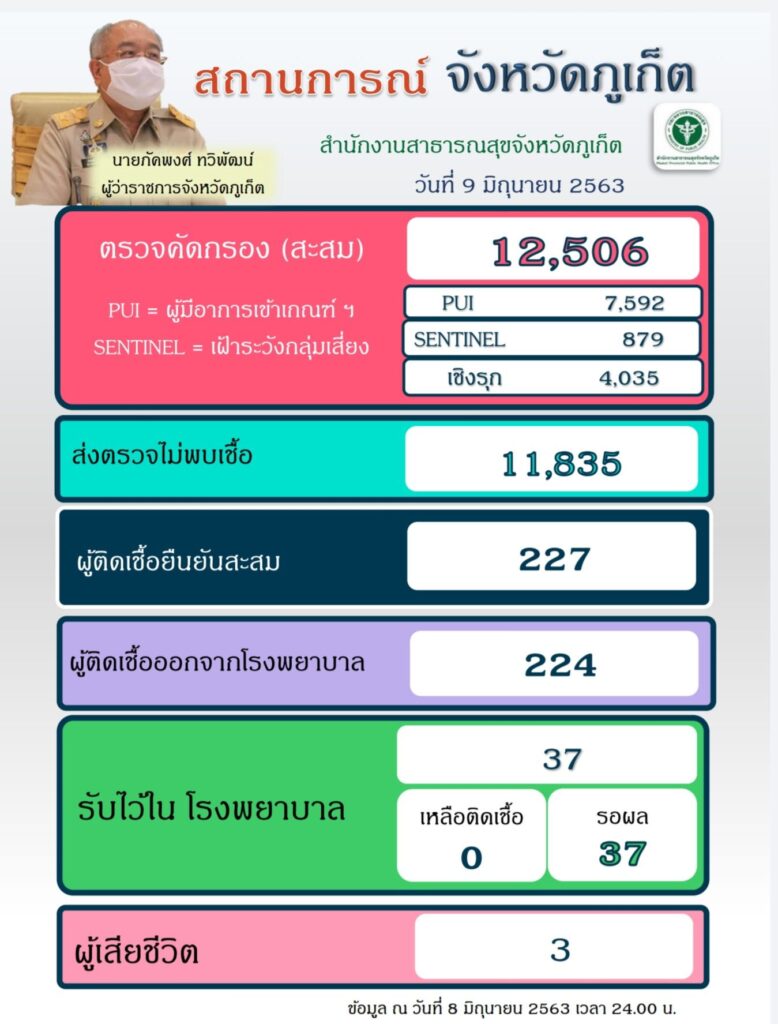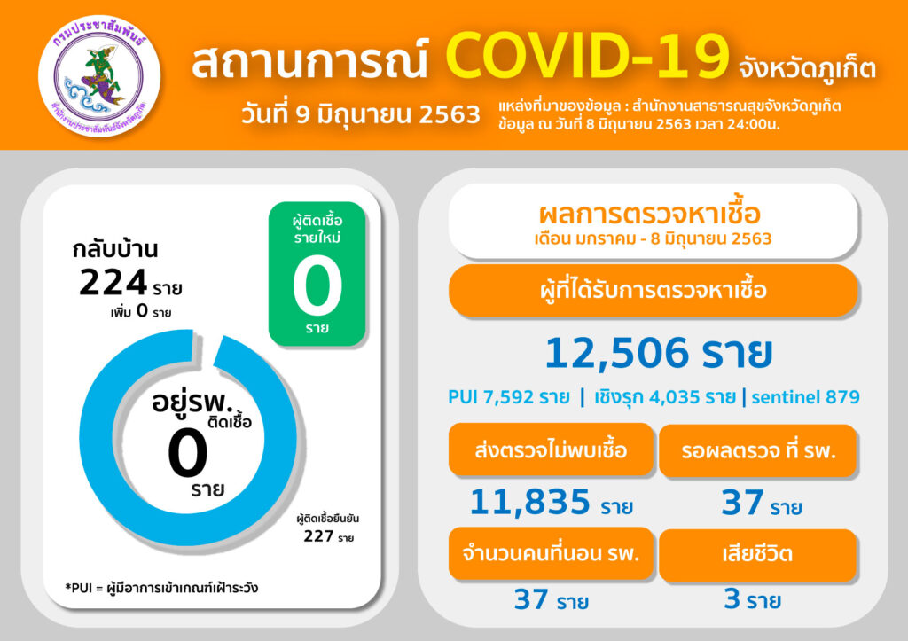 จังหวัดภูเก็ตมีผู้ติดเชื้อยืนยันโรคโควิด-19 จำนวน 227 ราย รักษาหายให้กลับบ้าน 223 ราย เสียชีวิต 3 ราย จำหน่าย 1 ราย ไม่มีผู้ติดเชื้อรายใหม่เพิ่ม