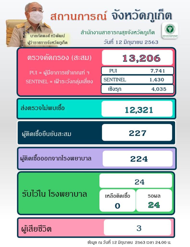 จังหวัดภูเก็ตมีผู้ติดเชื้อยืนยัน โรคโควิด-19 จำนวน 227 ราย รักษาหายให้กลับบ้าน 223 ราย เสียชีวิต 3 ราย จำหน่าย 1 ราย ไม่มีผู้ติดเชื้อรายใหม่เพิ่ม