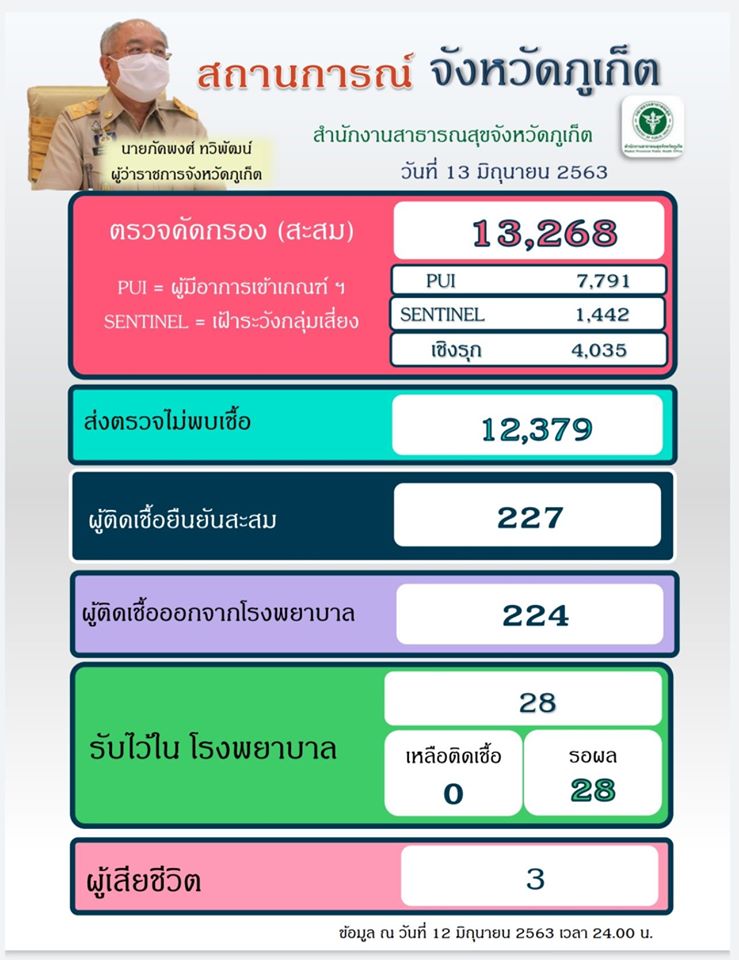เมื่อวันที่ 13 มิถุนายน 2563 คณะกรรมการโรคติดต่อจังหวัดภูเก็ต ขอแจ้งให้ทราบว่า ณ วันที่ 12 มิถุนายน 2563 ไม่มีผู้ติดเชื้อรายใหม่เพิ่ม โดยตั้งแต่วันที่ 5 มกราคม – 12 มิถุนายน 2563 จังหวัดภูเก็ตมีผู้ติดเชื้อยืนยัน โรคโควิด-19 จำนวน 227 ราย รักษาหายให้กลับบ้าน 223 ราย เสียชีวิต 3 ราย จำหน่าย 1 ราย