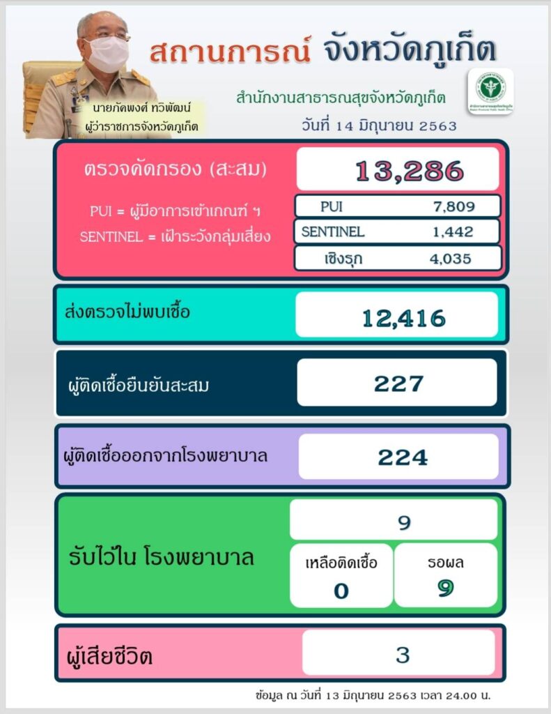 จังหวัดภูเก็ตมีผู้ติดเชื้อยืนยัน โรคโควิด-19 จำนวน 227 ราย รักษาหายให้กลับบ้าน 223 ราย เสียชีวิต 3 ราย จำหน่าย 1 ราย ไม่มีผู้ติดเชื้อรายใหม่เพิ่ม
