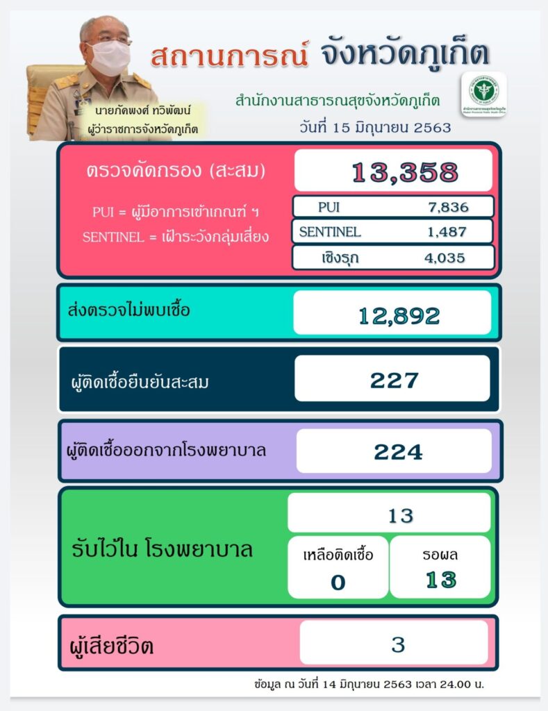 เมื่อวันที่15 มิถุนายน 2563 คณะกรรมการโรคติดต่อจังหวัดภูเก็ต ขอแจ้งให้ทราบว่า ณ วันที่ 14 มิถุนายน 2563 ไม่มีผู้ติดเชื้อรายใหม่เพิ่ม โดยตั้งแต่วันที่ 5 มกราคม – 14 มิถุนายน 2563 จังหวัดภูเก็ตมีผู้ติดเชื้อยืนยัน โรคโควิด-19 จำนวน 227 ราย รักษาหายให้กลับบ้าน 223 ราย เสียชีวิต 3 ราย จำหน่าย 1 ราย