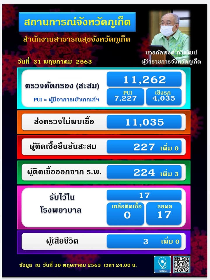 คณะกรรมการโรคติดต่อจังหวัดภูเก็ต ขอแจ้งให้ทราบว่า ตั้งแต่วันที่ 5 มกราคม – 30 พฤษภาคม 2563 จังหวัดภูเก็ตมีผู้ติดเชื้อยืนยันโรคโควิด-19 แล้วจำนวน 227 ราย (ไม่พบรายใหม่)โดยผู้ติดเชื้อได้รับอนุญาต ให้กลับบ้าน 223 ราย (กลับบ้านเพิ่ม 3 ราย) เสียชีวิต 3 ราย (ไม่มีผู้เสียชีวิตเพิ่ม) จำหน่าย 1 ราย (ไม่มีจำหน่ายเพิ่ม) ปัจจุบันไม่มีผู้ติดเชื้อยืนยันโรคโควิด-19 รับการรักษาพยาบาล