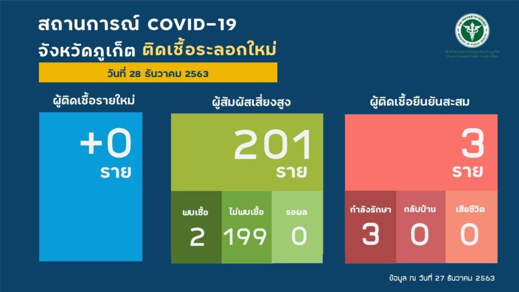 สถานการณ์โควิด-19 จังหวัดภูเก็ต วันที่ 28 ธันวาคม 2563 ไม่พบผู้ป่วยใหม่เพิ่ม ผู้ป่วยยังคงที่ 3 ราย ผู้ที่อยู่ในกลุ่มเสี่ยงสูงผลตรวจเป็นลบได้รับการกักตัว มีการเฝ้าระวังวัดอุณหภูมิทุกวัน การเตรียมความพร้อมในการป้องกันการะบาดใหม่ของโควิด-19 แบ่งเป็น 4 พื้นที่สถานการณ์ ซึ่งจังหวัดภูเก็ตจัดอยู่ในพื้นที่สีเหลืองหรือพื้นที่เฝ้าระวังสูงสุด ( ผู้ติดเชื้อ ≤ 10 คนและสามารถควบคุมได้) เร่งรัดการตรวจหาผู้ติดเชื้อเชิงรุกในพื้นที่เสี่ยง กลุ่มบุคคลที่เสี่ยงและกิจการที่เสี่ยง