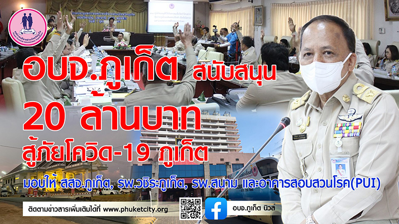 องค์การบริหารส่วนจังหวัดภูเก็ต สนับสนุนงบประมาณ 20 ล้านบาท ให้กับสาธารณสุขจังหวัดภูเก็ต และโรงพยาบาลวชิระภูเก็ต เพื่อจัดหาอุปกรณ์ทางการแพทย์และสาธารณสุขรวมถึงการบริหารจัดการโรงพยาบาลสนามและอาคารสอบสวนโรค(PUI) ซึ่งเป็นส่วนสำคัญในการป้องกันและควบคุมการแพร่ระบาดของเชื้อไวรัสโควิด-19 ในจังหวัดภูเก็ต