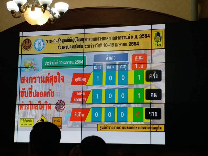 วันที่ 11 เมษายน 2564 นายพิเชษฐ์ ปาณะพงศ์ รองผู้ว่าราชการจังหวัดภูเก็ตเป็นประธานประชุมสรุปผลการดำเนินงานศูนย์ปฏิบัติการป้องกันและลดอุบัติเหตุทางถนนและทางทะเลช่วงเทศกาลสงกรานต์ พ. ศ. 2564 ระหว่างวันที่ 10-16 เมษายน 2564