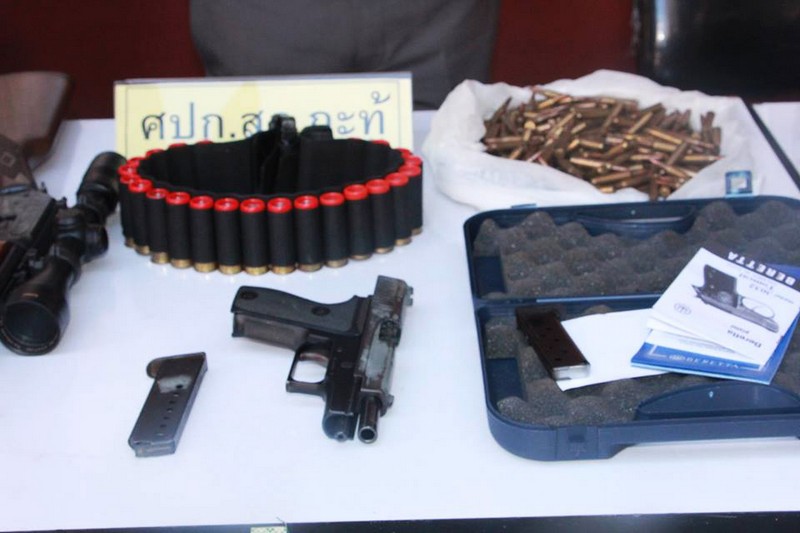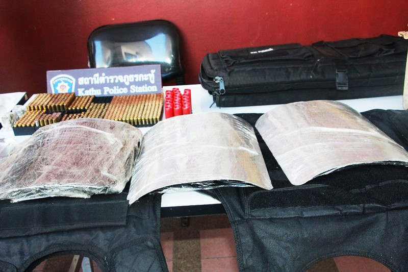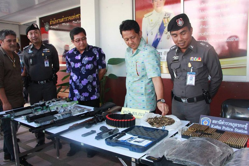 โดยจับกุมได้พร้อมของกลาง อยู่ในตู้นิรภัยในบ้านที่เกิดเหตุ บ้านเลขที่ 180 ถ.หมื่นเงิน ต.ป่าตอง อ.กะทู้ ดังนี้ อาวุธปืนพกสั้น ชนิดกึ่งอัตโนมัติ ยี่ห้อซิกซาวเออร์ ขนาด 9 มม. สีดำ พร้อมซองบรรจุเครื่องกระสุนปืน จำนวน 1 กระบอก อาวุธปืนยาว ชนิดเดี่ยวไรเฟิล ยี่ห้อ THE MARLIN FIREARMS MODEL 18640 ขนาด .357 สีดำ จำนวน 1 กระบอก เครื่องกระสุนปืน ขนาด .38 จำนวน 122 นัด เครื่องกระสุนปืน ขนาด 9 มม. จำนวน 466 นัด เครื่องกระสุนปืน ขนาดเบอร์ 12 จำนวน 19 นัด เครื่องกระสุนปืน ขนาด .32 จำนวน 36 นัด แผ่นเหล็กสำหรับใช้สำหรับเสื้อเกราะกันกระสุน จำนวน 2 ชุด( 6 ชิ้น) นอกจากนี้ยังมีเสื้อเกราะกันกระสุนปืน จำนวน 2 ตัว และซองใส่อาวุธปืนยาวแบบผ้าสีดำ จำนวน 2 ซอง ที่พบหน้าตู้เสื้อผ้าภายในที่เกิดเหตุ อาวุธปืนยาวเดี่ยวลูกซอง 8 นัด ขนาด 12 สายสะพายบรรจุเครื่องกระสุนปืนขนาดลูกซองเบอร์ 12 พร้อมเครื่องกระสุนปืนลูกซองขนาดเบอร์ 12 จำนวน 24 นัด พบภายในห้องนอนภายในบ้านที่เกิดเหตุอาวุธปืน M 16 จำนวน 2 กระบอก (ถอดแยกชิ้นส่วน) ซองบรรจุเครื่องกระสุนปืน M 16 ขนาด 5.56 มม.จำนวน 4 อัน ท่อเก็บเสียงสำหรับติดปลายลำกล้องปืน ชนิดสั้น จำนวน 2 อัน ชนิดยาว จำนวน 1 อัน เครื่องกระสุนปืน ขนาด .357 จำนวน 17 นัด เครื่องกระสุนปืน ขนาด 9 มม. จำนวน 6 นัด และเครื่องกระสุนขนาด 5.56 (M 16) จำนวน 272 นัด ใส่รวมกันไว้ในกล่องไฟเบอร์กลาส สีเทา วางอยู่ที่บริเวณโรงรถของบ้านที่เกิดเหตุ