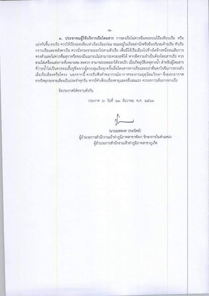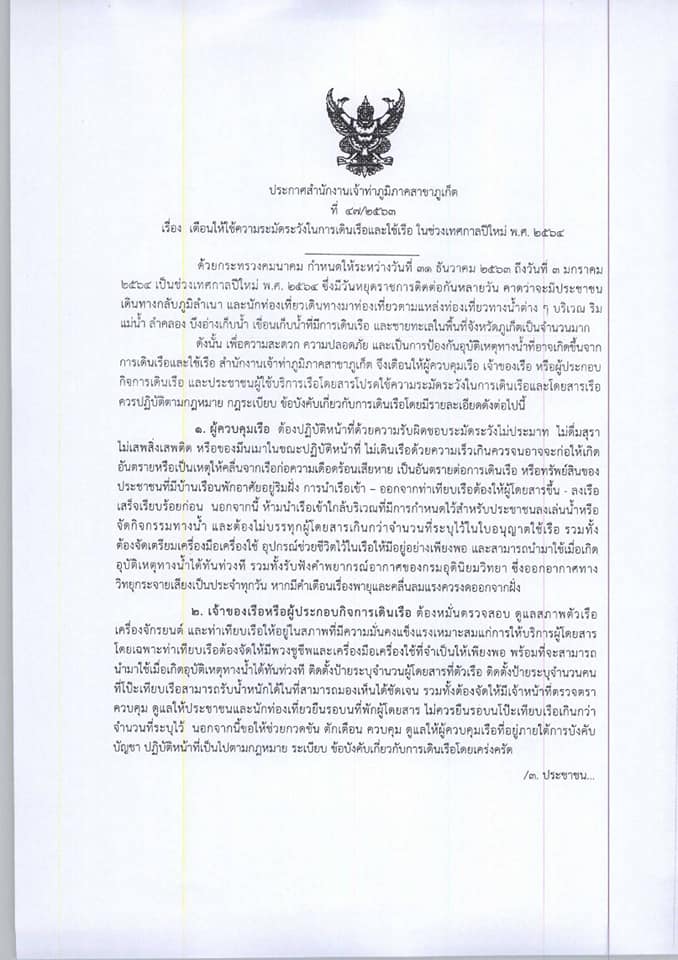 เจ้าท่าภูมิภาคสาขาภูเก็ต ออกประกาศ ที่ 47/2563 เตือนใช้ความระมัดระวังในการเดินเรือและใช้เรือในช่วงเทศกาลปีใหม่ 2564 เพื่อ ความปลอดภัย และป้องกันอุบัติเหตุทางน้ำที่อาจเกิดขึ้นได้