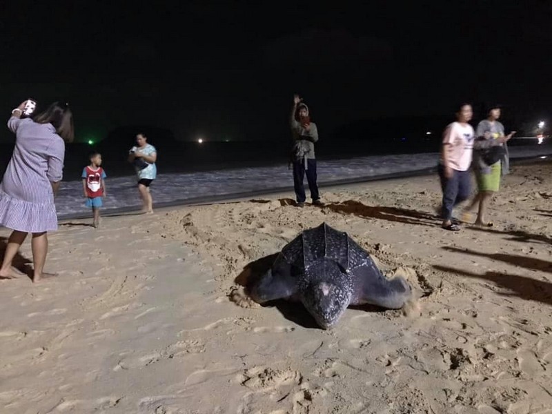 ภูเก็ตแม่เต่ามะเฟืองขนาดใหญ่ ขึ้นวางไข่หน้าหาดกะตะ เป็นครั้งแรกในรอบหลายสิบปี ท่ามกลางประชาชนที่รอเคาท์ดาวน์ริมหาด เจ้าหน้าที่สทช.10 เข้าล้อมคอกดูแลความปลอดภัย