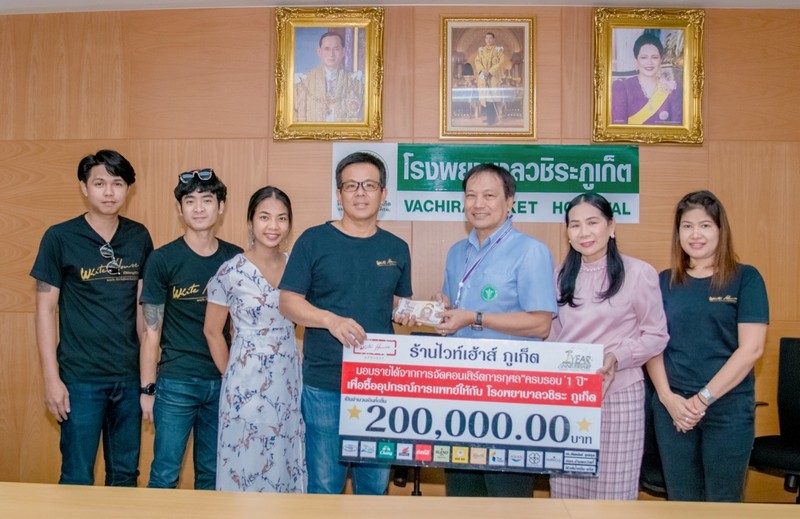 นายณภักษ์พงศ์ สิริบุณยเวช และนางสาวสาวิตรี ช่วยณรงค์ ผู้บริหาร White House ภูเก็ต พร้อมผู้บริหารและพนักงาน มอบเงินสดจำนวน 200,000 บาท ให้กับทางโรงพยาบาลวชิระภูเก็ต เพื่อร่วมสมทบทุนซื้ออุปกรณ์การแพทย์ ในโอกาสจัดงานคอนเสิร์ตการกุศลครบรอบ 1 ปีร้าน White House ภูเก็ต โดยมีนายแพทย์เฉลิมพงษ์ สุคนธผล ผู้อำนวยการโรงพยาบาลวชิระภูเก็ต เป็นผู้รับมอบ